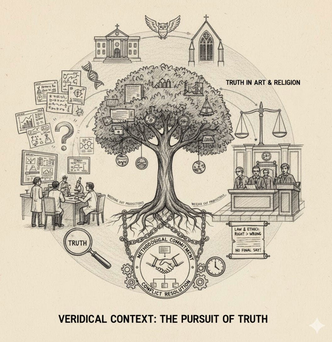 Lastly, there is a specialized, and highly important veridical context – a web that is significant because it basically involves questions about truth. In short, this is a context for broad or narrow truth-seeking enterprises. This involves the world of science: scientific truths and the validity of scientific claims are an important part of it. However, truth can also be about non-science issues. For instance, it can be about truth in art or truth and religion, and it can extend to issues of law and ethics, about what is right or wrong. The rules here eschew fixed and final views – the basic rule is: no one has a final say! – but they lead to norms and standards for the truth-seeking enterprise. The veridical context is a context with an ethos and methods of weeding out propositions and evidence that do not stand up to scrutiny. Therefore, it is not a place just for universities and scholars: it may even be that, in some academic disciplines, their adherence to this context has weakened over time and shifted into tribal modes. It is also in this context we find other important institutions like courts