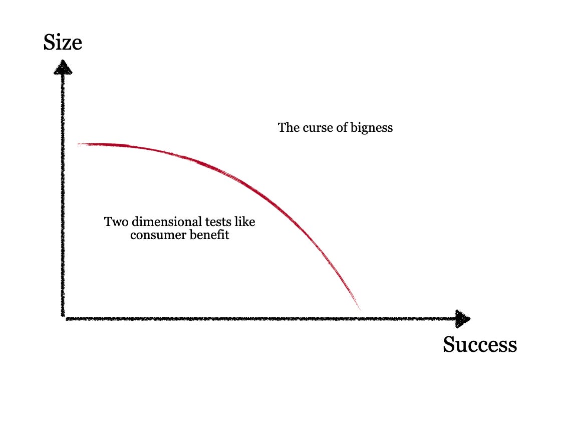 A large and successful company will have a harder time with competition issues than a small and failing company - but this is not captured will in the simpler models. And if we also add time and note that persistently large and successful companies are under even more competition policy scrutiny - no matter the outcomes for consumers or innovation - we see that the solution space for competition policy concerns is actually quite narrow for a persistently large and successful company: they end up in the curse of bigness (to steal and slightly change a term from Justice Brandeis) where the only test for the adequacy of a political intervention is if it reduces a company’s size and success.