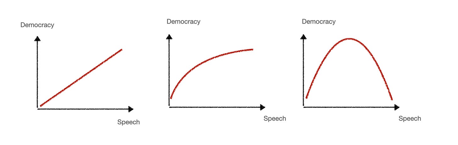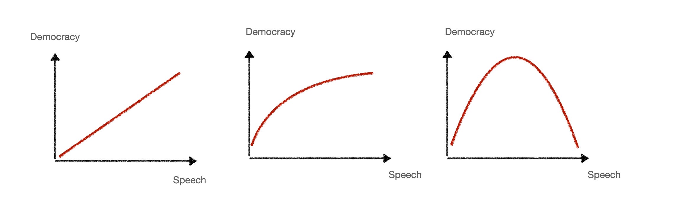 Mathematical functions are excellent tools to formulate hypotheses and to explore them, and it is a pity that math is taught in such an abysmal way that we do not all feel comfortable playing with functions of different kinds. Just asking what kind of function describes a phenomenon best is helpful: is it linear? Exponential? Just thinking about different possible functions in a graph can inform the way we understand something. Let's take a timely example: how do we think the amount of free speech in a society relates to the robustness of democracy in that society? We can express very different theories in three very simple functions: