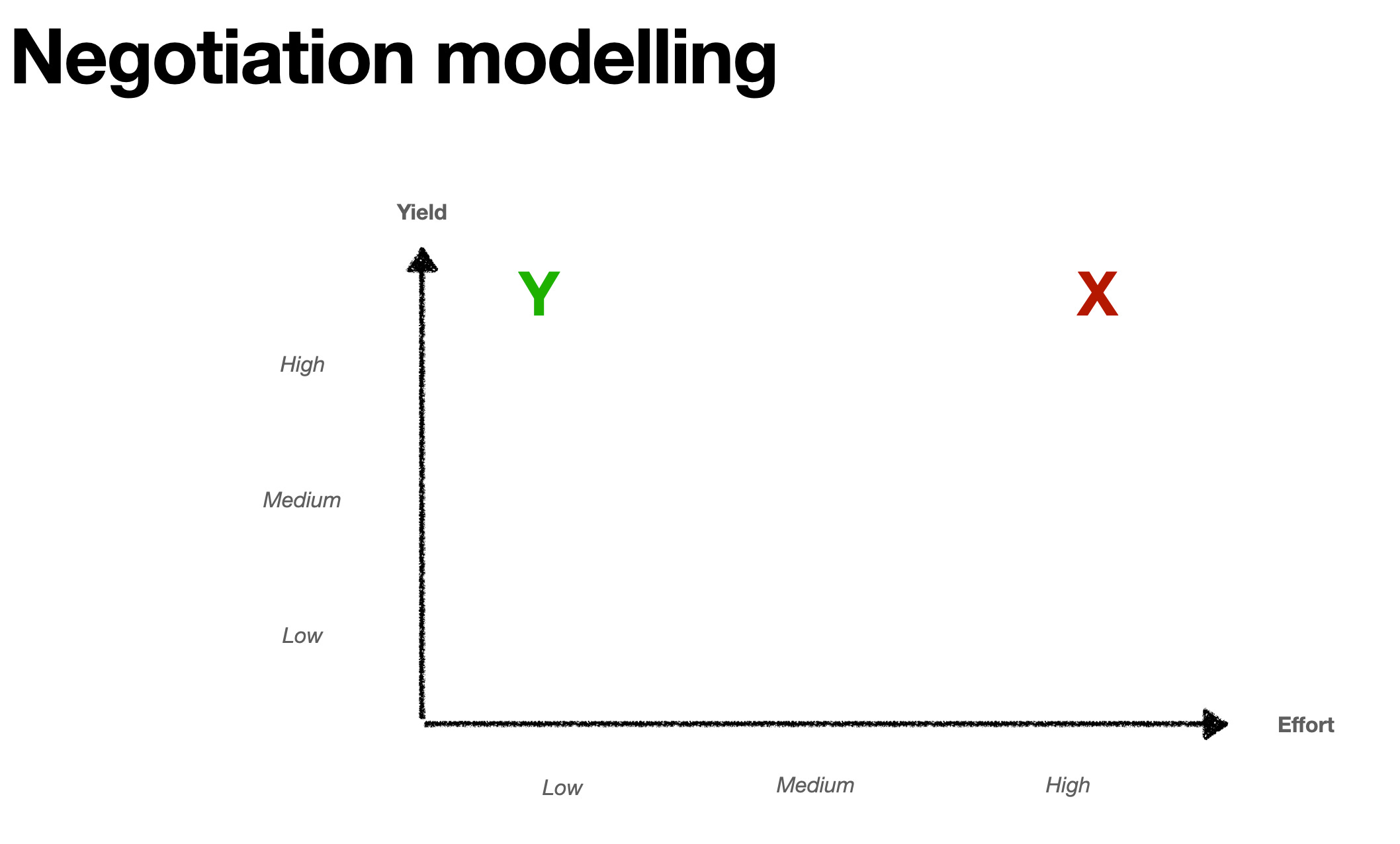 This simple map gives you an idea of where the different actors land and where there are empty categories in your on-going negotiation. Another mapping that can be helpful is to look at yield and effort - how much would it take to get someone to change their opinion? Many operations make the mistake of going after high yield / high effort (X in the chart) actors rather than exploring if there are actors that could have high yield with lower effort (Y in the chart). The allure is clear to see - changing X's mind is a heroic task, after all -- but is it the best way for you to spend your resources and time?