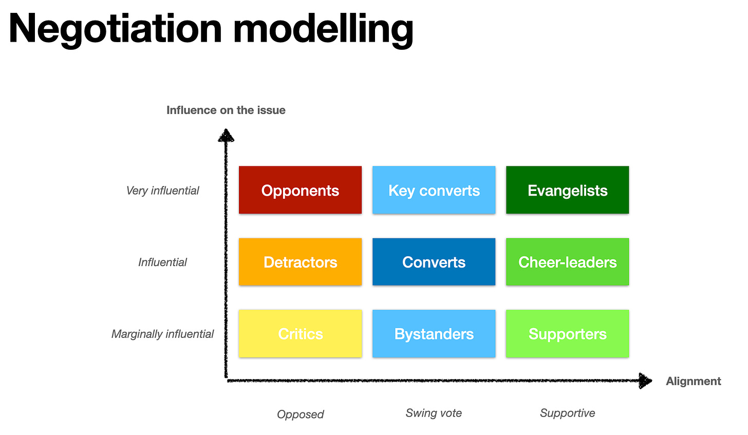 Third, use the negotiation model. Put it up on a wall, make it into a standing agenda item - examine how you are doing with the different actors, and if they have become more or less likely to align with you. If the tool you are building is not used, it serves little purpose to develop it.