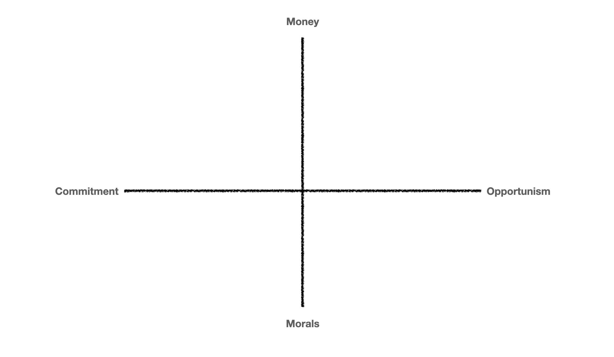 Another to map the participants is to look at what their main motivation is. There are several different ways of doing this, but one simple schema is the pay-out/persistence schema where you categorise participants in a negotiation as primarily motivated by money or morals (that is, by economic gain or values) and then try to determine if they are in the negotiation because they think it is an opportunity or because they are committed to it in an a more existential way (is it a nice to have or a must have). This allows you to identify the actors that could be bought off (the money / opportunistic ones) and the ones that are likely to persist no matter what (the values / committed ones). The opportunistic value-seekers are often gadfly intellectuals or others that tend to be less effective, and the committed money seekers are the actors that think you are eating their lunch.